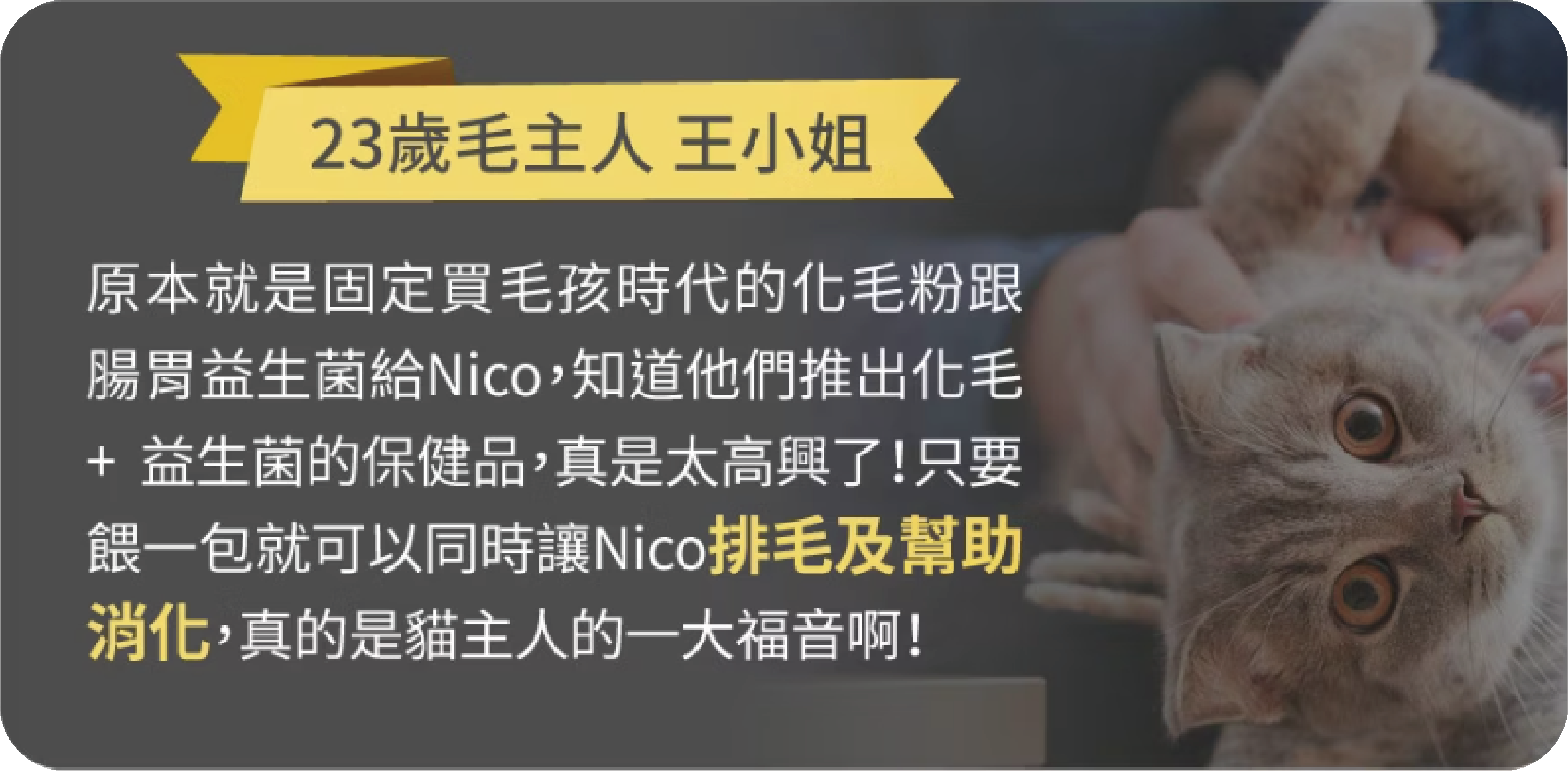 毛孩(尤其是貓)已經有吃化毛粉了,為什麼還需要益生菌呢?因貓咪除了長期用嘴巴梳理掉落的毛髮,會造成腸胃累積大量毛髮,造成毛髮可能無法順利排出,長期累積的毛髮還會損害腸胃道環境。當吞入的毛球量過多又無法被分解時,會造成乾咳、嘔吐(帶毛髮)、食慾降低等症狀。