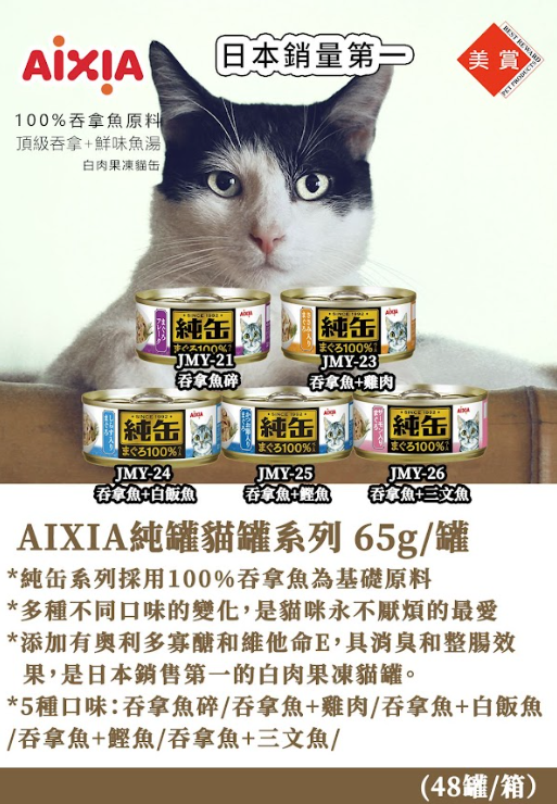 [$408/48罐]AIXIA 愛喜雅 貓罐頭 純罐 吞拿魚+鰹魚 65g (深藍)