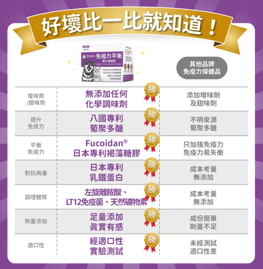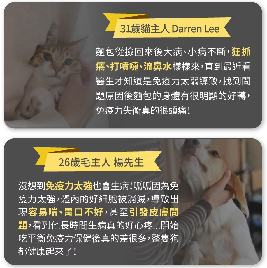 我們按照慣例以市售成份最佳為目標,導正市面多數保健品以提高免疫力為目標,研發出可以真正改善體質的免疫力平衡保健粉,用溫和天然的方式讓毛孩免疫力維持最佳平衡。