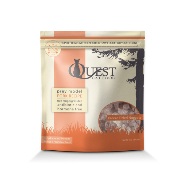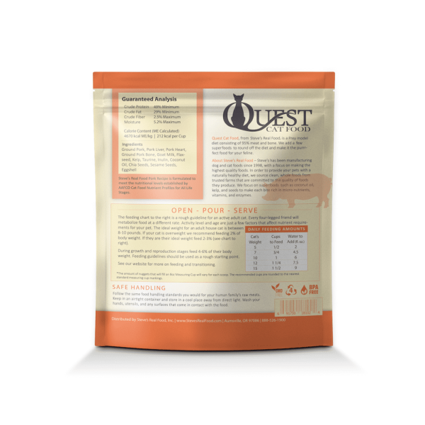 Quest Cat Food 是一種 Prey 模型飲食,由 95% 的肉、骨頭和器官組成。我們添加了一些超級食物來完善飲食,使其成為您的貓科動物的完美食物。我們將食物製成一口大小的小塊,讓貓更容易鑽進一碗新鮮食物中。我們使用提供高水平鋅和銅的瘦、低脂肪肌肉肉——這兩種營養素共同作用以支持新陳代謝。Steve’s Real Food 豬肉食譜是一種冷凍乾燥的生貓糧,其配方超過了 AAFCO Cat Food Nutrient Profiles for All Life Stages 確定的營養水平。