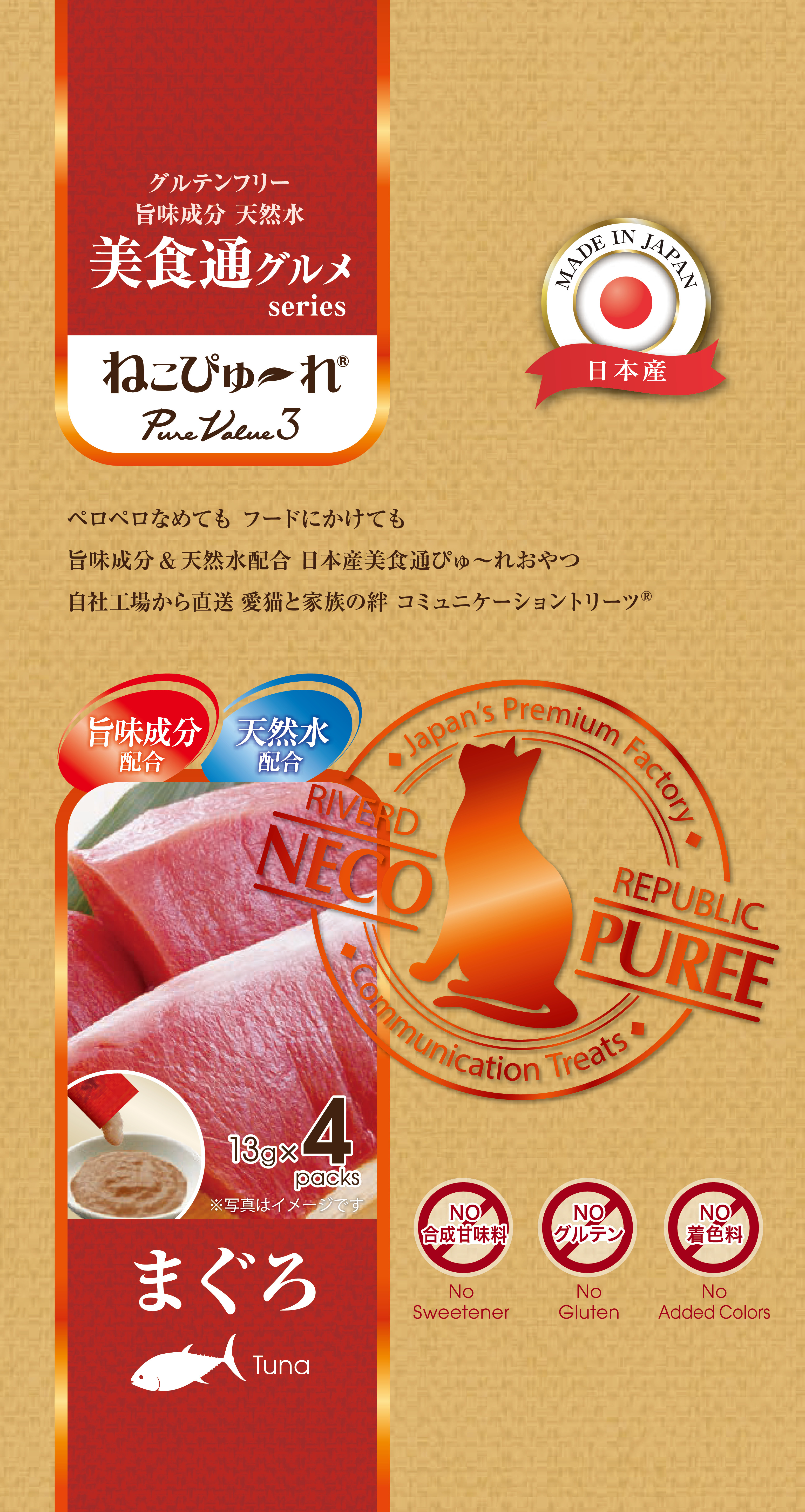 PureValue3吞拿魚肉泥醬醬,採用鮮味成分和天然水配製而成,貓咪可以舔食或撒在食物上享用。Riverd Republic 精心製作,專為貓咪打造的美味佳餚。直接從我們位於鳥取縣的工廠出貨。