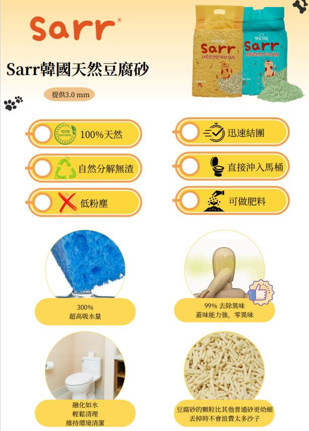 韓國 Sarr 天然豆腐貓砂 原味 3.0mm 7L (橙)
