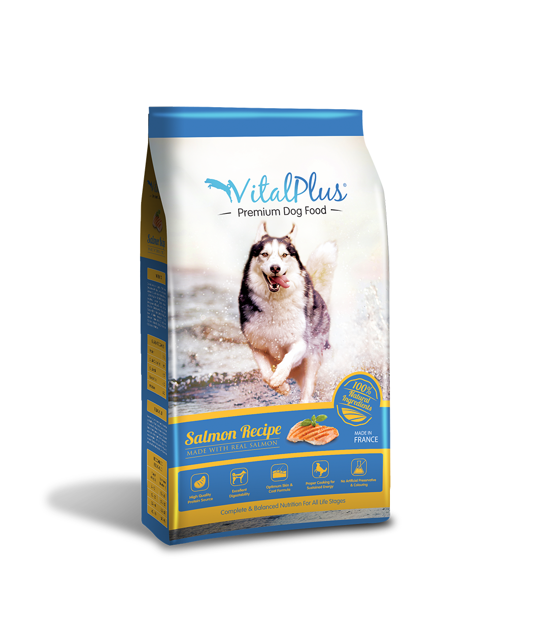 VitalPlus 高級犬糧鮭魚配方是一款適合所有犬種的全面均衡營養食品。它選用高生物價的真正鮭魚,富含能量的精選優質蛋白質,並添加了狗狗健康生活所需的維生素和礦物質。我們的鮭魚配方含有易消化的碳水化合物,有助於消化,預防腸道疾病。此外,它還添加了多種營養補充劑,全面照顧狗狗的健康。維生素A、銅和必需脂肪酸有助於保持毛髮柔軟亮澤;維生素E和硒有助於增強免疫系統。堅硬酥脆的顆粒也有助於強健牙齒,促進口腔健康。
